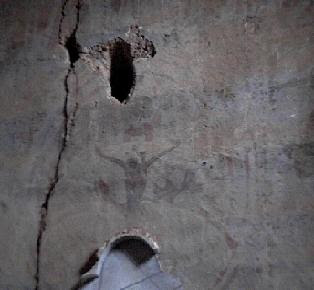 Antes de que comenzaran los trabajos de restauración se toparon con el registro inferior que estaba tapado por unas espantosas pinturas de tipo decorativo y el resto del muro recorrido de arriba abajo por una enorme grieta y cubierto por una gruesa capa de polvo y mortero desprendido que dificultaba considerablemente la identificación de las escenas. Poco a poco se fueron descubriendo un mural distribuido en cuatro registros del que se han podido identificar las siguientes escenas: